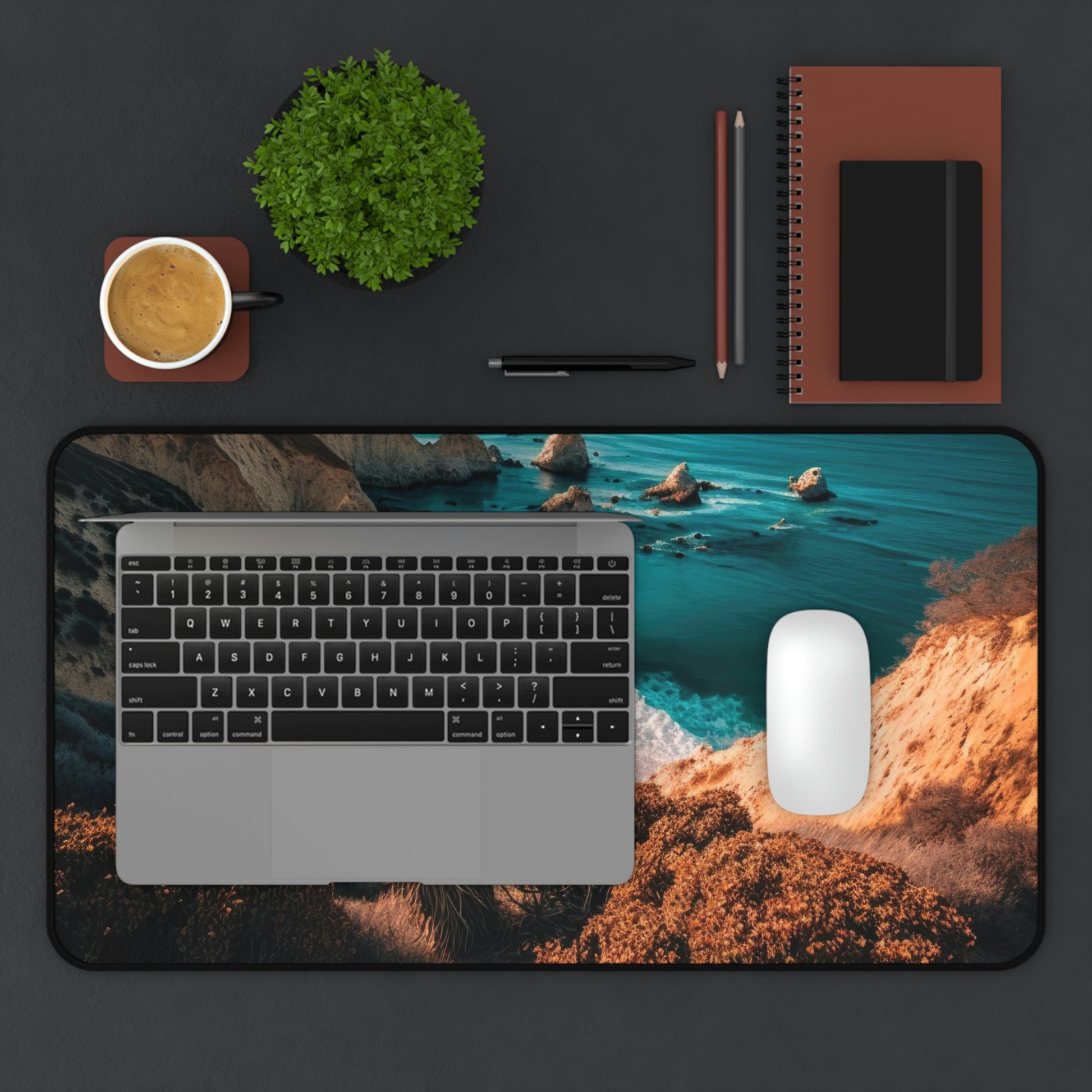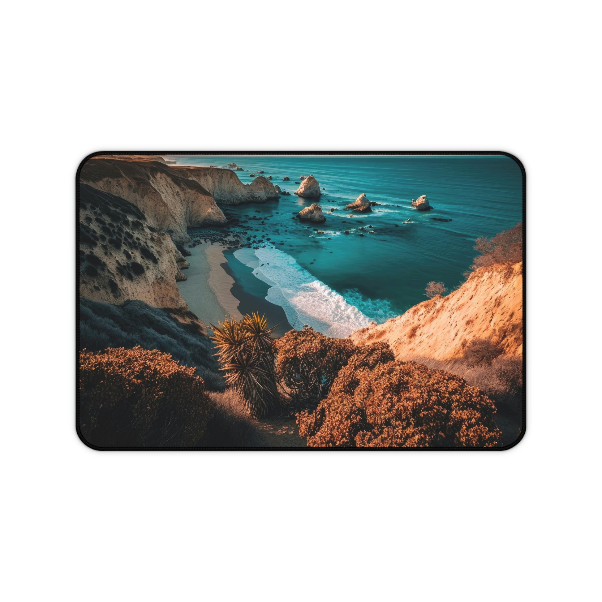 This Desk Mat features a beach landscape print on the front that will bring a touch of paradise to any desk or workspace! It's a great way to add a little summer escape to any room without leaving the comfort of home. Crafted from a durable, water-resistant material, this Desk Mat is perfect for protecting your desk or table surface from beverages and other items throughout the day. Whether you're working on your laptop or just relaxing, this is the perfect accessory to up your home office vibe. #homedecor #deskmat #beachscape #homeofficevibe #interiordesign #workspace #timesaving #desksurfaceprotection #durable #waterresistant #accessory #paradisevibes #craftsmanship