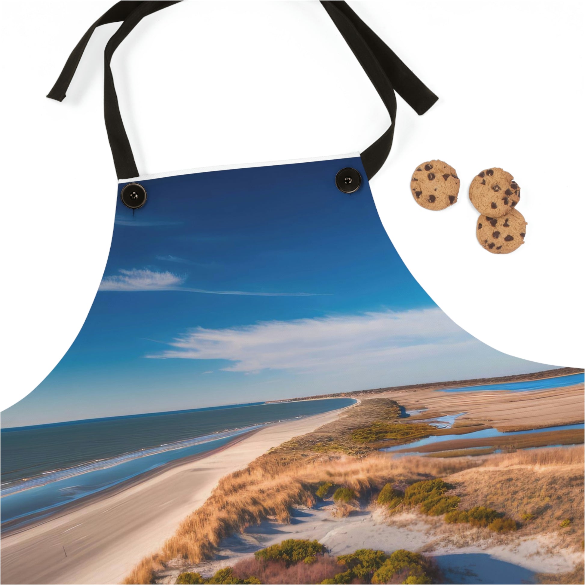 This beach landscape apron is perfect for any kitchen adventurer! It features a colorful print of a beach landscape with a tropical color scheme. This apron is made of a cotton and polyester blend and is machine washable. Its adjustable neck loop and extra long waist ties make it easy to fit multiple body sizes. Make meal-time or baking time a beach vacation and show off your sunny style with this beach landscape apron! #chefapron #beachvibes #oceanviews #kitchendecor #summerstyle #chefsgear #cottonpolyblend #tropicalcolors #machinewashable #apronstyle #durableapron