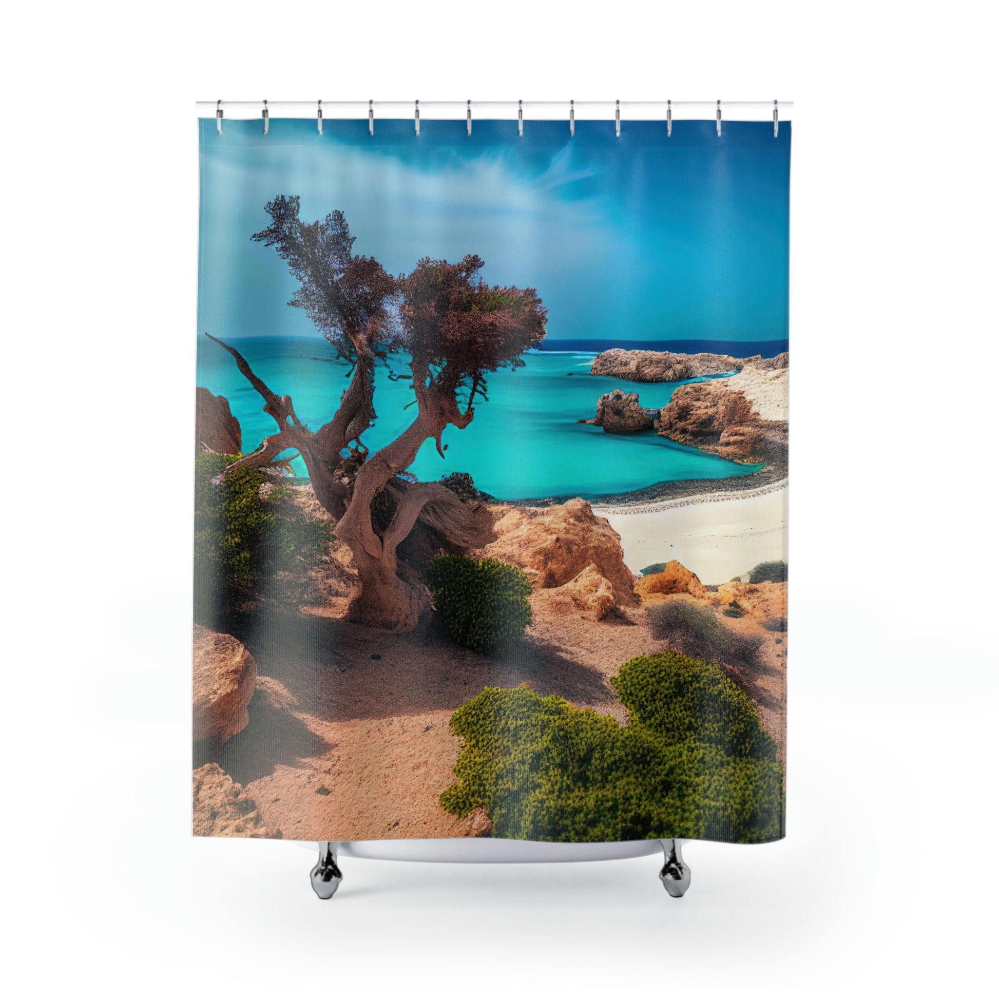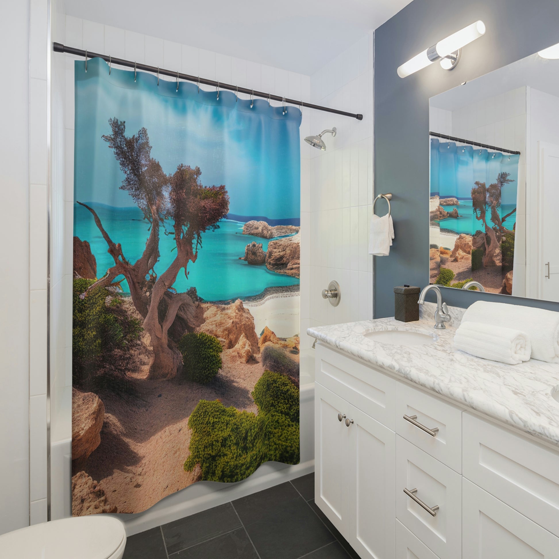 This beach landscape shower curtain is the perfect accessory for any seaside-inspired bathroom. The print on the front shows tranquil marine life and beautiful beach scenery, evoking peace and relaxation. The fabric is specially treated to withstand moisture, while the metal grommets provide durability and easy installation. Experience the beauty of the beach each time you enter the shower! #showercurtains #seascape #peacefulvibes #beachtropical #bathroomstyle #relaxing #exclusiveprint #homedecor #artfulaccessory #beachlife #bathdecoration